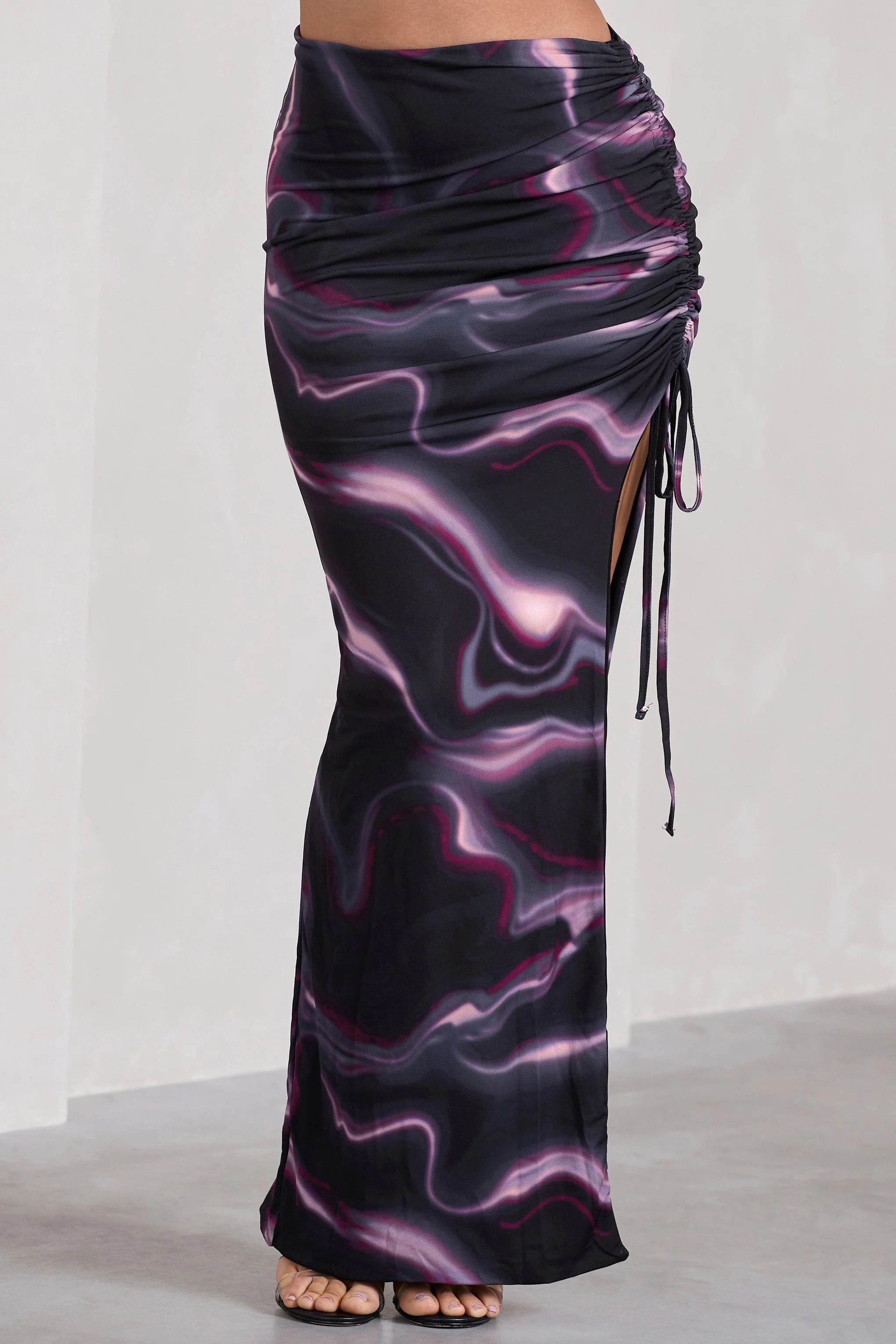 In The Air | Schwarzer bedruckter asymmetrischer Maxirock mit geraffter hoher Taille