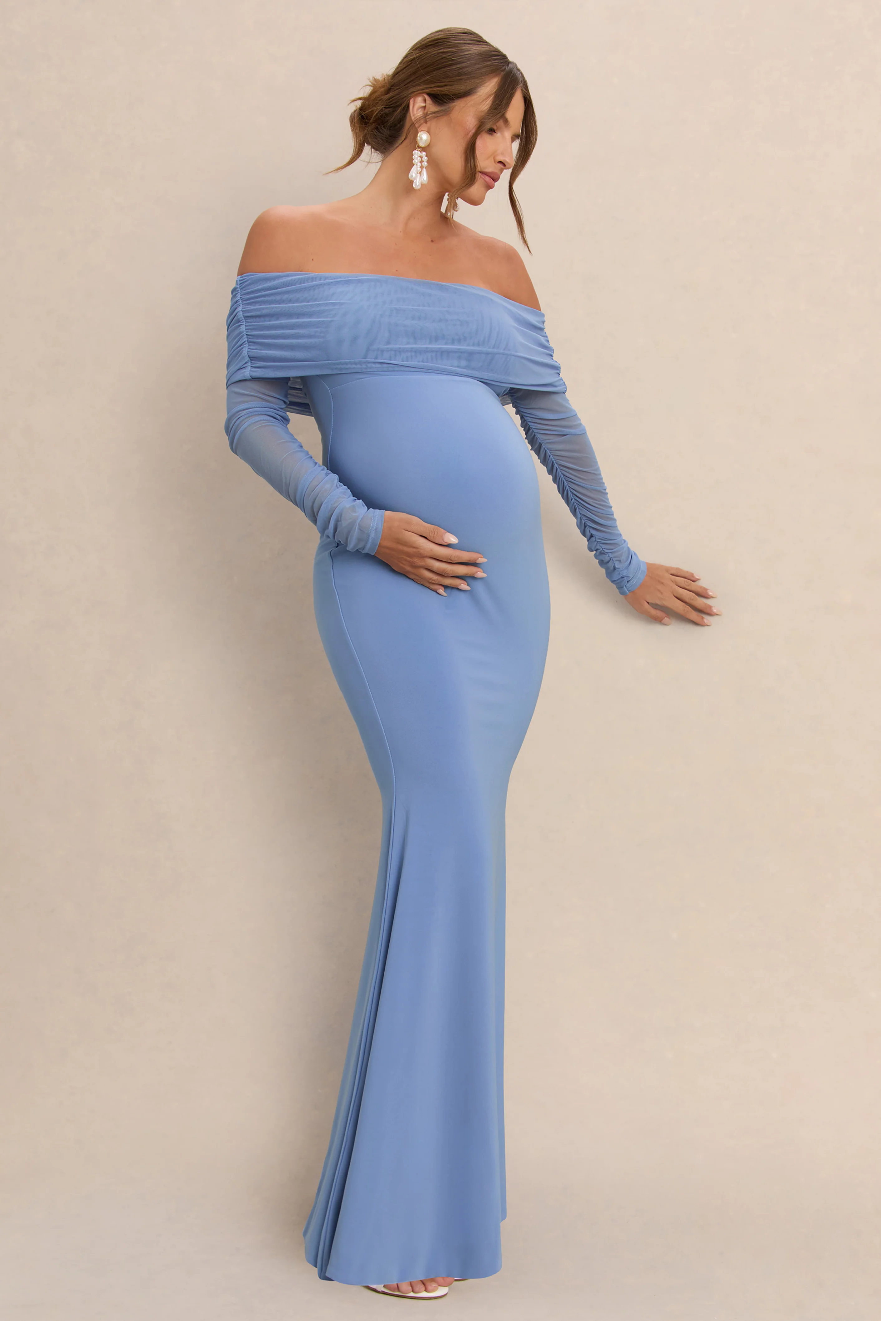 Pretty Perfect | Puderblaues Umstands-Bardot-Maxikleid aus Mesh mit Raffung